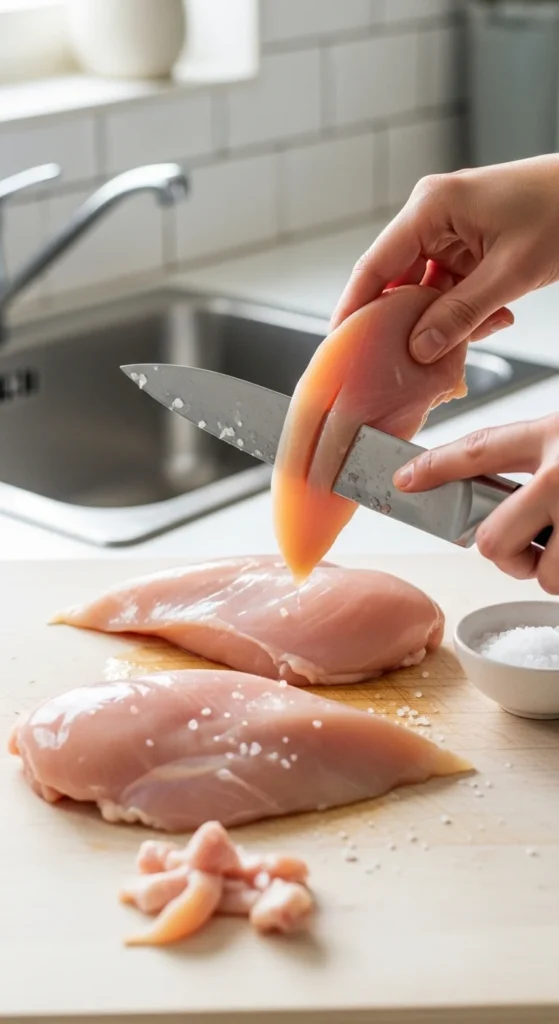 If breasts are very thick, slicing them horizontally or pounding them slightly helps create even cooking.