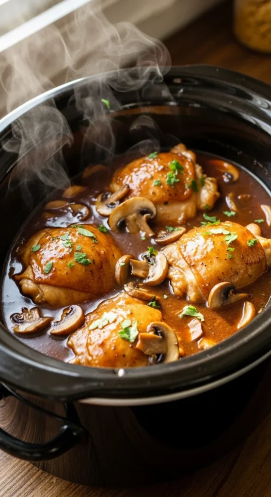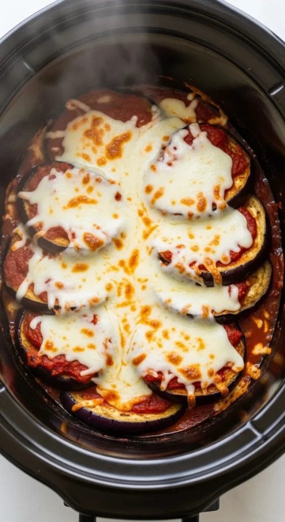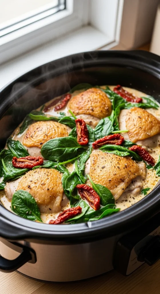 [Image Prompt: Slow cooker creamy spinach artichoke chicken topped with melted cheese, rustic kitchen background, no text.]