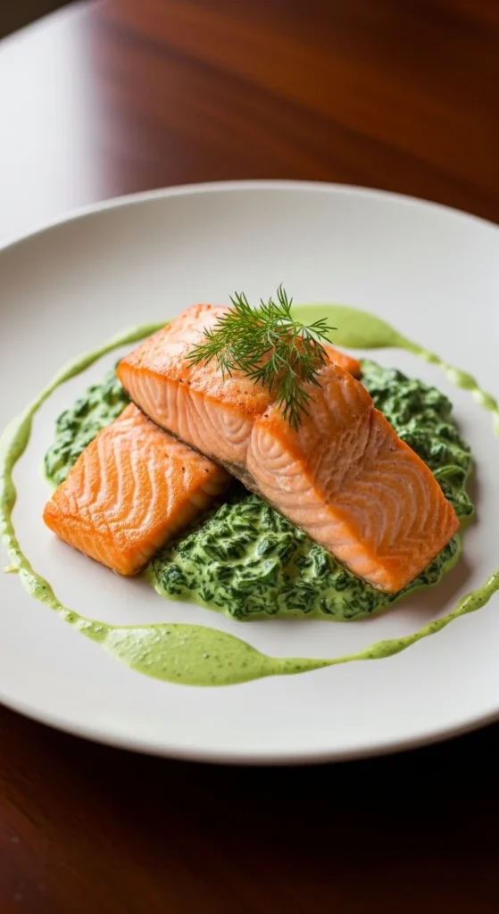 Rich salmon with creamy greens.