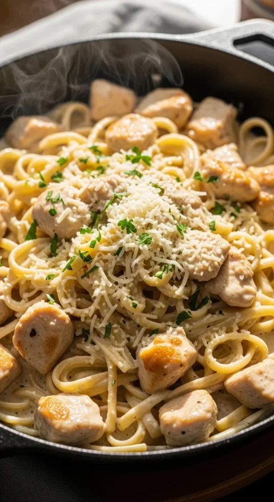 Savory, creamy pasta and protein cooked together in one pan.