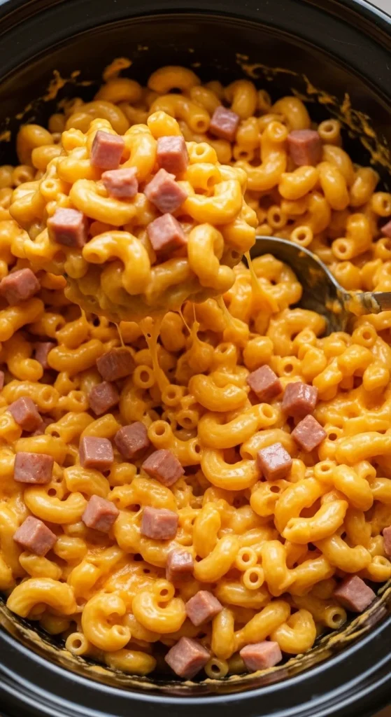 2. Mix pasta, cheese, milk, and ham in crockpot.