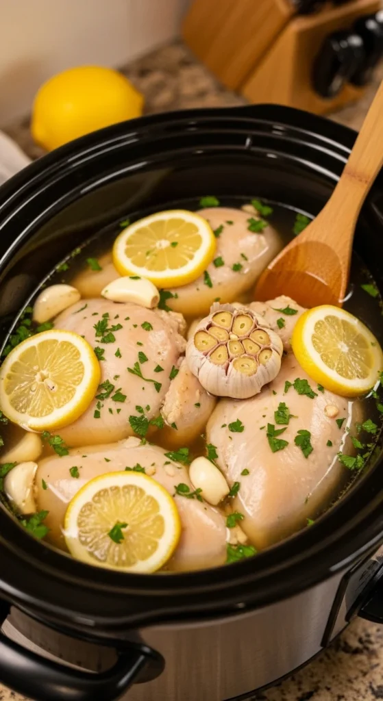 1. Place chicken, lemon, garlic, and broth in crockpot.
