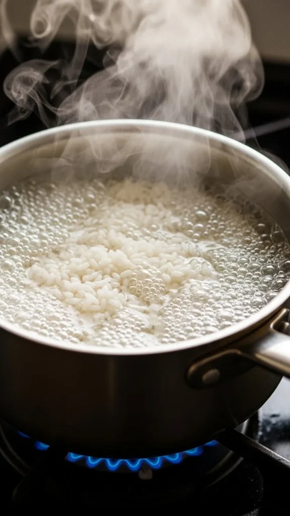[Image Prompt] Rice and water gently boiling in a saucepan just before being covered, steam visible above the surface.