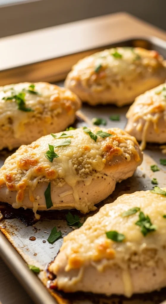 [Image Prompt] Baked chicken breasts on a baking tray, lightly golden with melted Parmesan crust, fresh parsley sprinkled on top, natural warm lighting, no text.