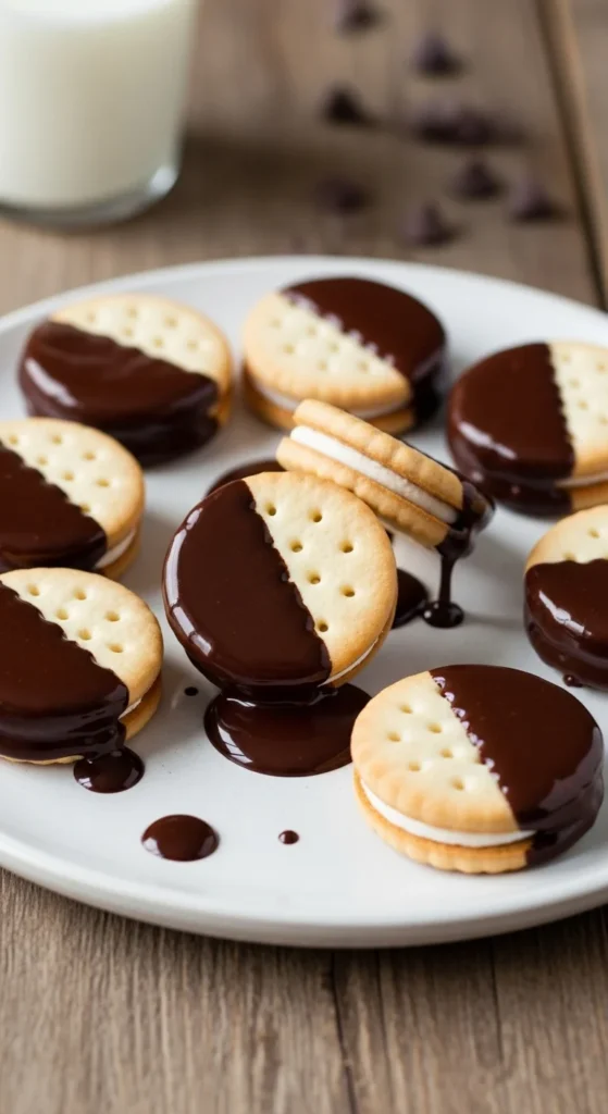 [Image Prompt: Half-dipped sandwich cookies.]