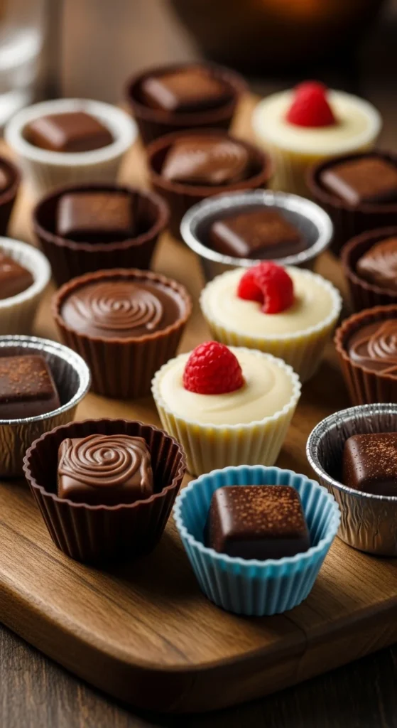 [Image Prompt: Mini cups filled with set chocolate candy.]