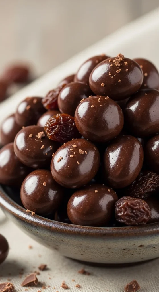 [Image Prompt: Chocolate-covered raisins piled in a small bowl, glossy coating, soft neutral background.]