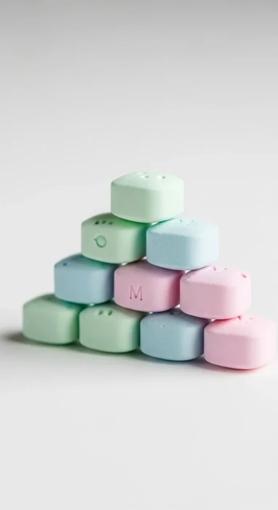 [Image Prompt: Small pastel-colored mints stacked neatly, matte finish.]
