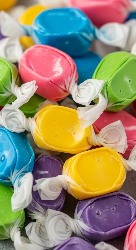 [Image Prompt: Chewy taffy pieces wrapped in wax paper, colorful and glossy.]