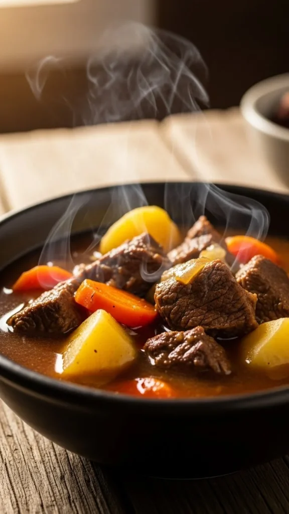 This beef stew cooks fast while keeping deep flavor. Use chuck roast cut at home to save money. Add potatoes, carrots, onion, and pantry spices. Skip browning when short on time. Pressure cooking softens the meat quickly.