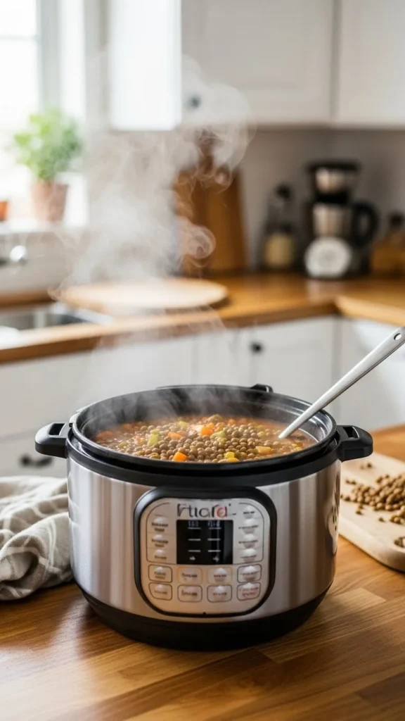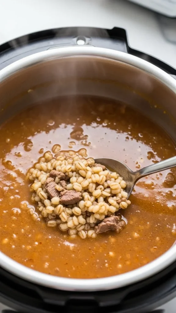 Barley stretches beef further. Add carrots, celery, and broth. Pressure cooking softens grains fast.