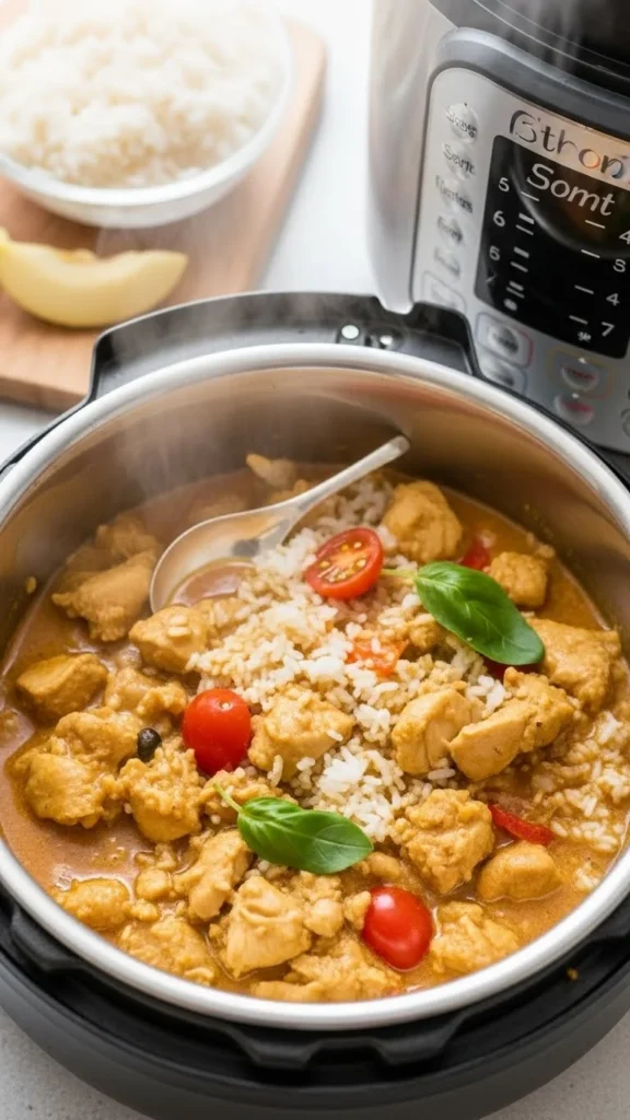Chicken thighs cook well under pressure. Add onion, curry powder, and canned coconut milk.