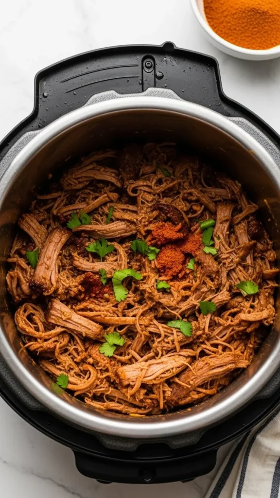Shredded beef cooks fast in the Instant Pot. Use chuck roast and spices.