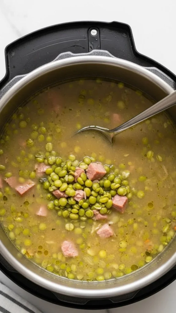 Split peas soften quickly under pressure. Add onion, carrot, and leftover ham.