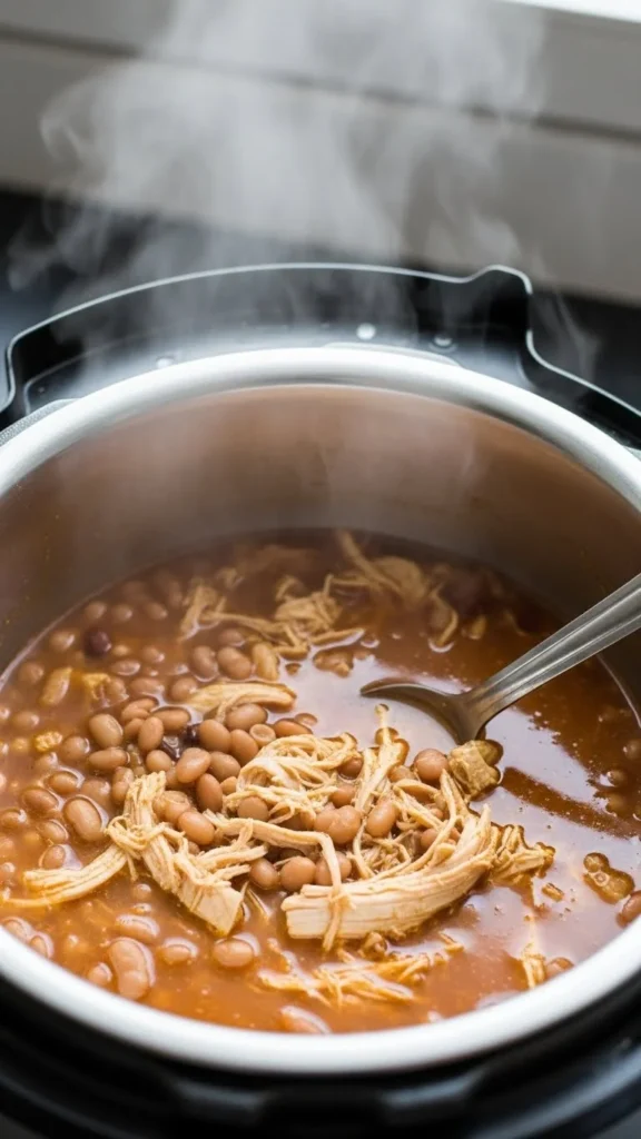White chili uses beans, chicken, and mild spices. Pressure cooking blends flavors fast.