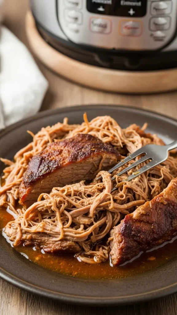 Pulled beef cooks quickly under pressure. Use beef shoulder when prices drop. Season simply and add broth. Shred easily after cooking.