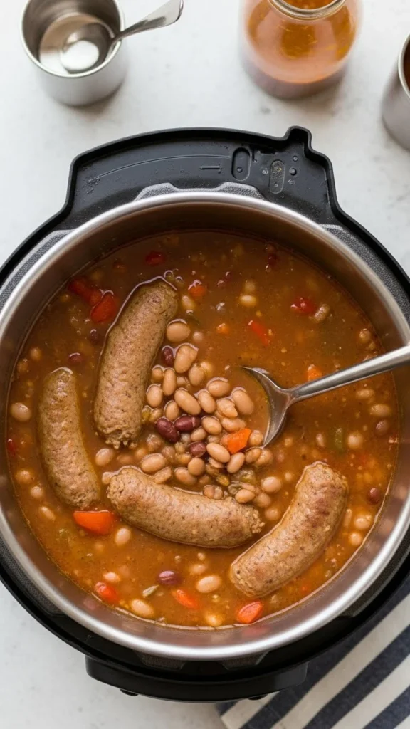 Smoked sausage adds flavor quickly. Pair with canned beans and broth. Pressure cooking softens everything evenly.