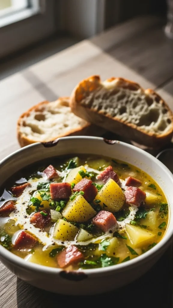 - Add potatoes, ham, broth.