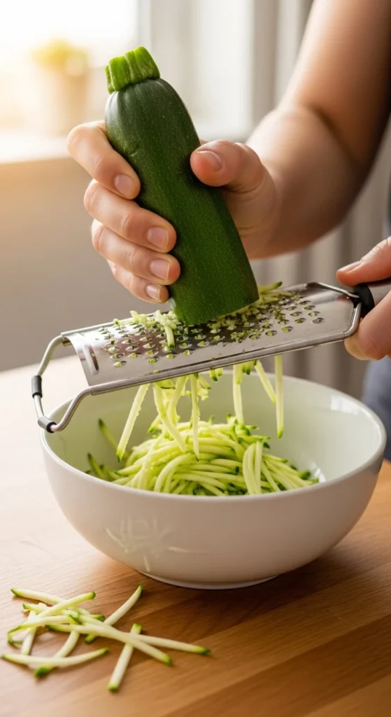 • Fresh grated zucchini releases natural juices that hydrate the batter.